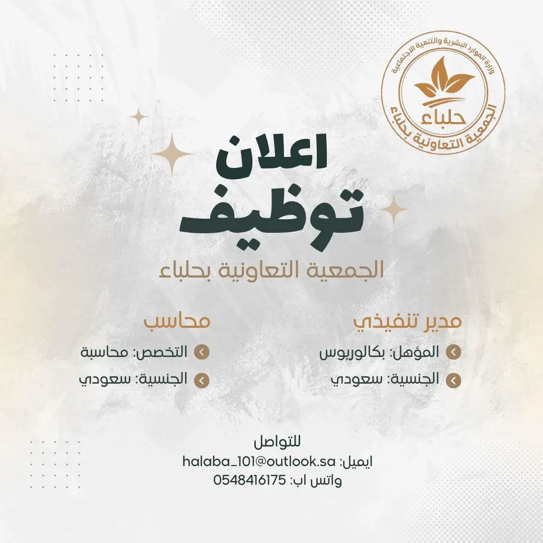 أعلنت الجمعية التعاونية بحلباء عن توفر فرص وظيفية لشغل عدد من المناصب، وذلك ضمن خطتها لتطوير أعمالها وتعزيز كوادرها البشرية بما يواكب أهدافها الاستراتيجية.